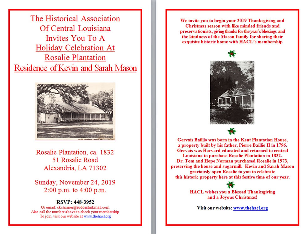 Members and guests are invited to the Holiday Celebration on Sunday afternoon, November 24, from 2:00 p.m. to 4:00 p.m. at the Rosalie Plantation House. This will be a wonderful way to kick off your holidays with good food and friends.